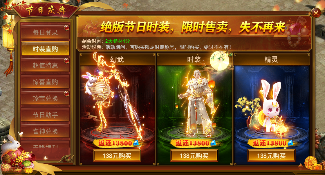 活动期间可购买中秋专属时装,华丽外观,节日气氛满满,限时购买。