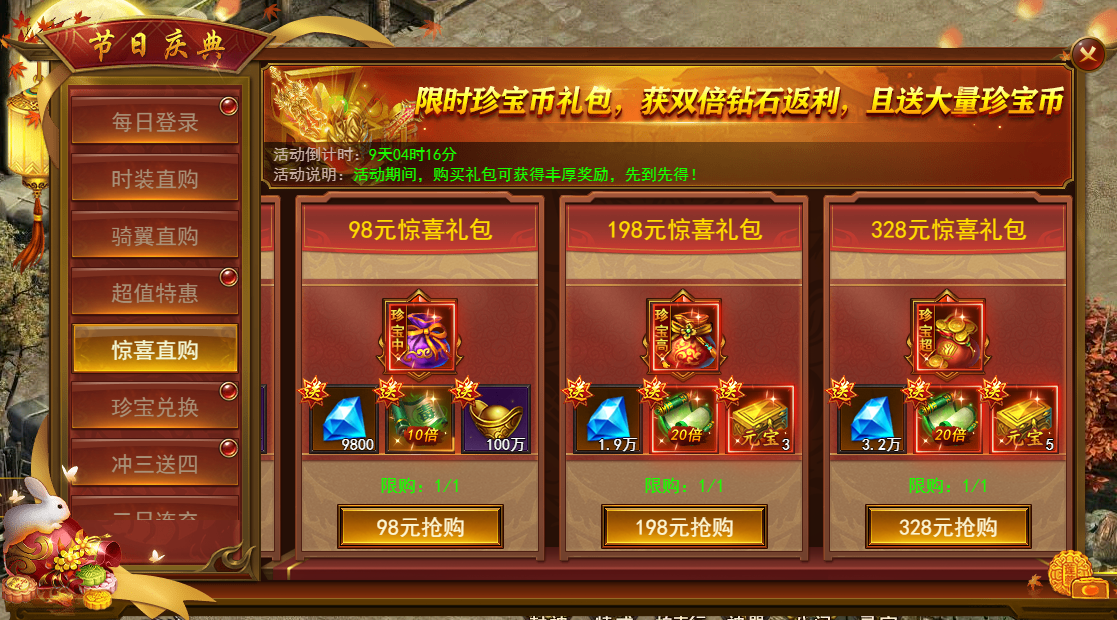 活动期间开启超值特惠活动,购买礼包赠送珍宝币,珍宝币可用于兑换极品道具,礼包每日重置。