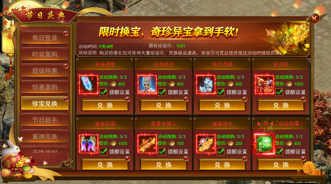活动期间可使用珍宝币兑换各种超值道具,限时兑换,机会不容错过。