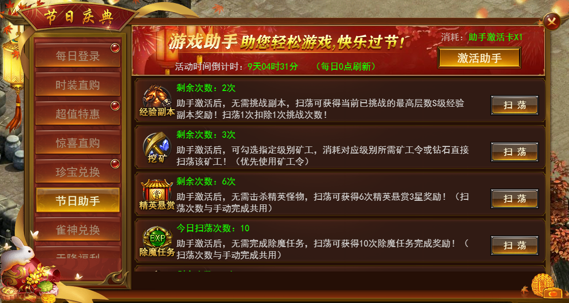 活动期间每天手机登录游戏都可免费获得节日助手激活卡,激活后能快速完成日常任务。