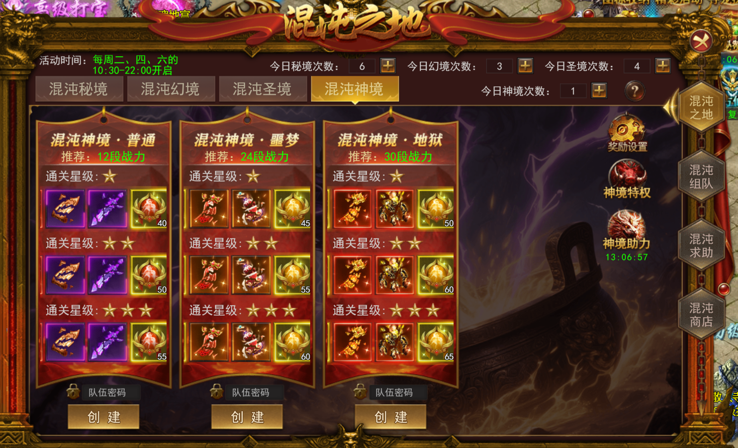 (1)副本有3个难度,普通/地狱/噩梦;达到开启天数后,满足战力、混沌值等条件