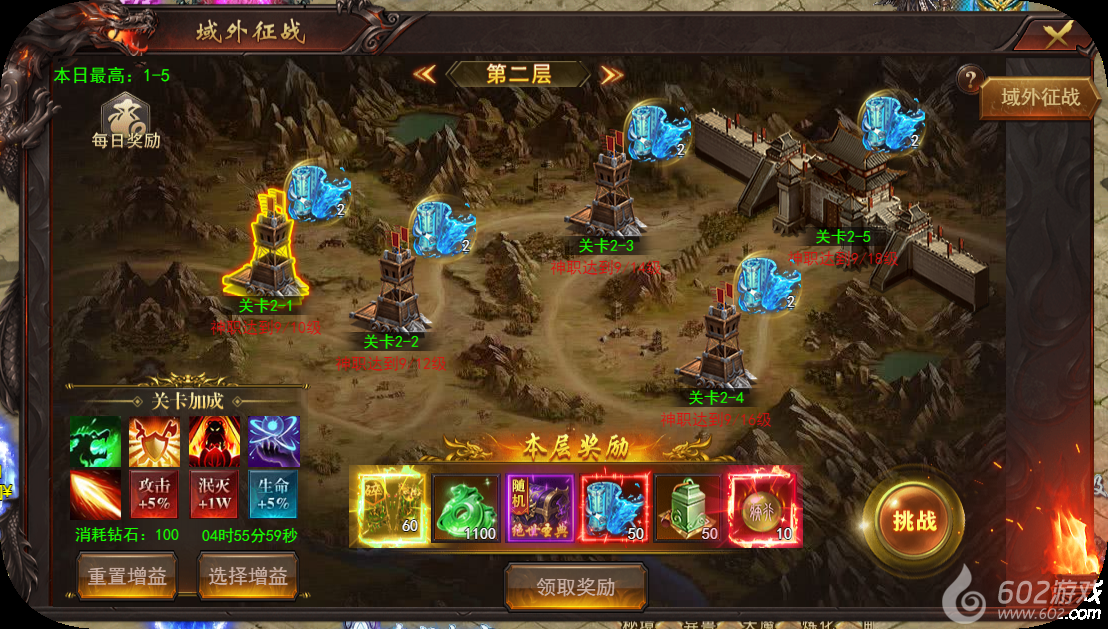 -通关每一层的全部5关能领取本层奖励,每周一0点会重置所有关卡的通关状态